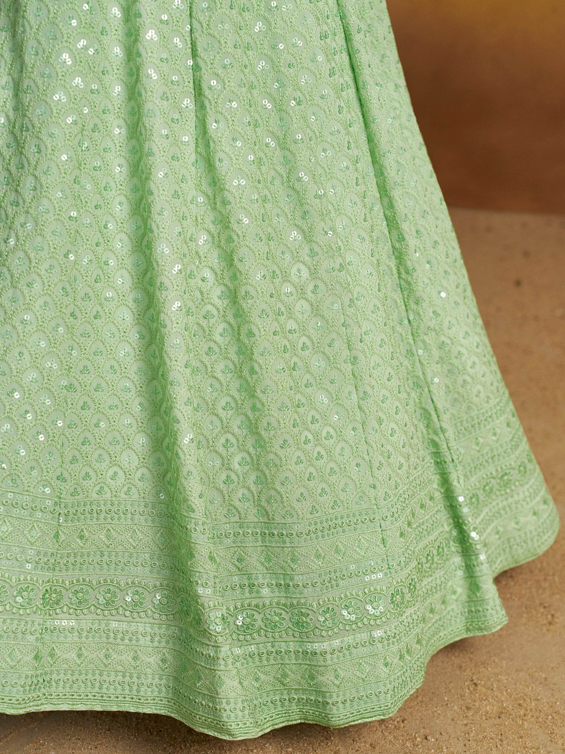 - Make a graceful statement with this enchanting mint green color georgette lehenga, adorned with delicate sequins and thread embroidered work that brings a soft shimmer and refined elegance.