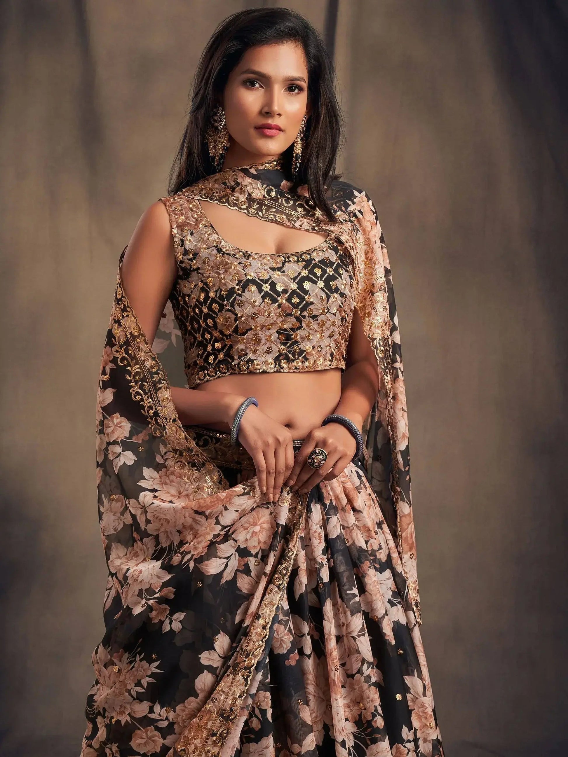 - Steal the show carrying this black color lehenga made of organza material designed floral print with zari and sequins embroidery work.