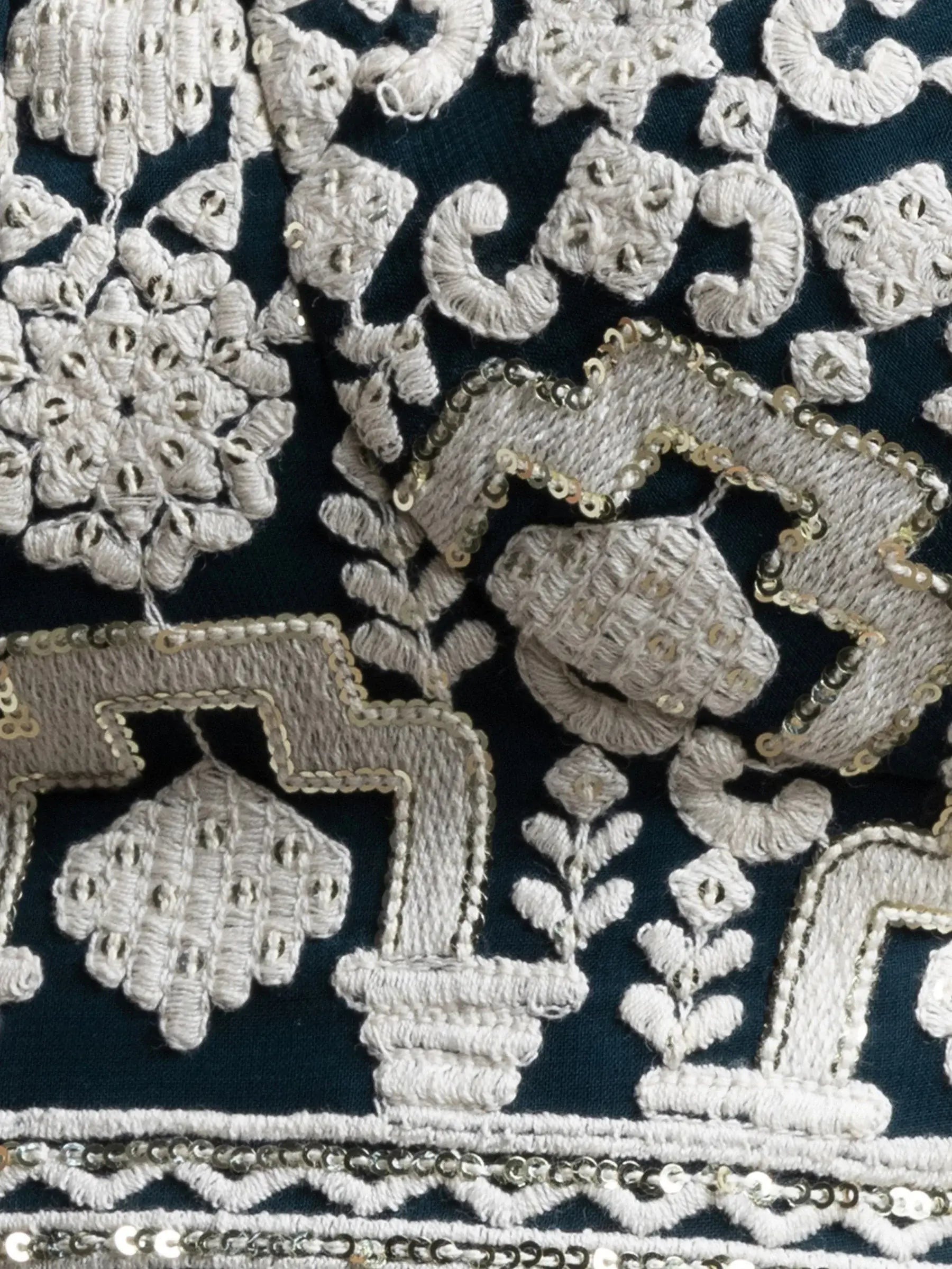- This captivating dark green georgette wedding lehenga is beautifully designed with intricate floral thread embroidery and shimmering sequins work, creating a regal and elegant look. It is paired with a matching georgette blouse that features similar embroidery, ensuring a perfectly coordinated ensemble for brides and wedding celebrations.