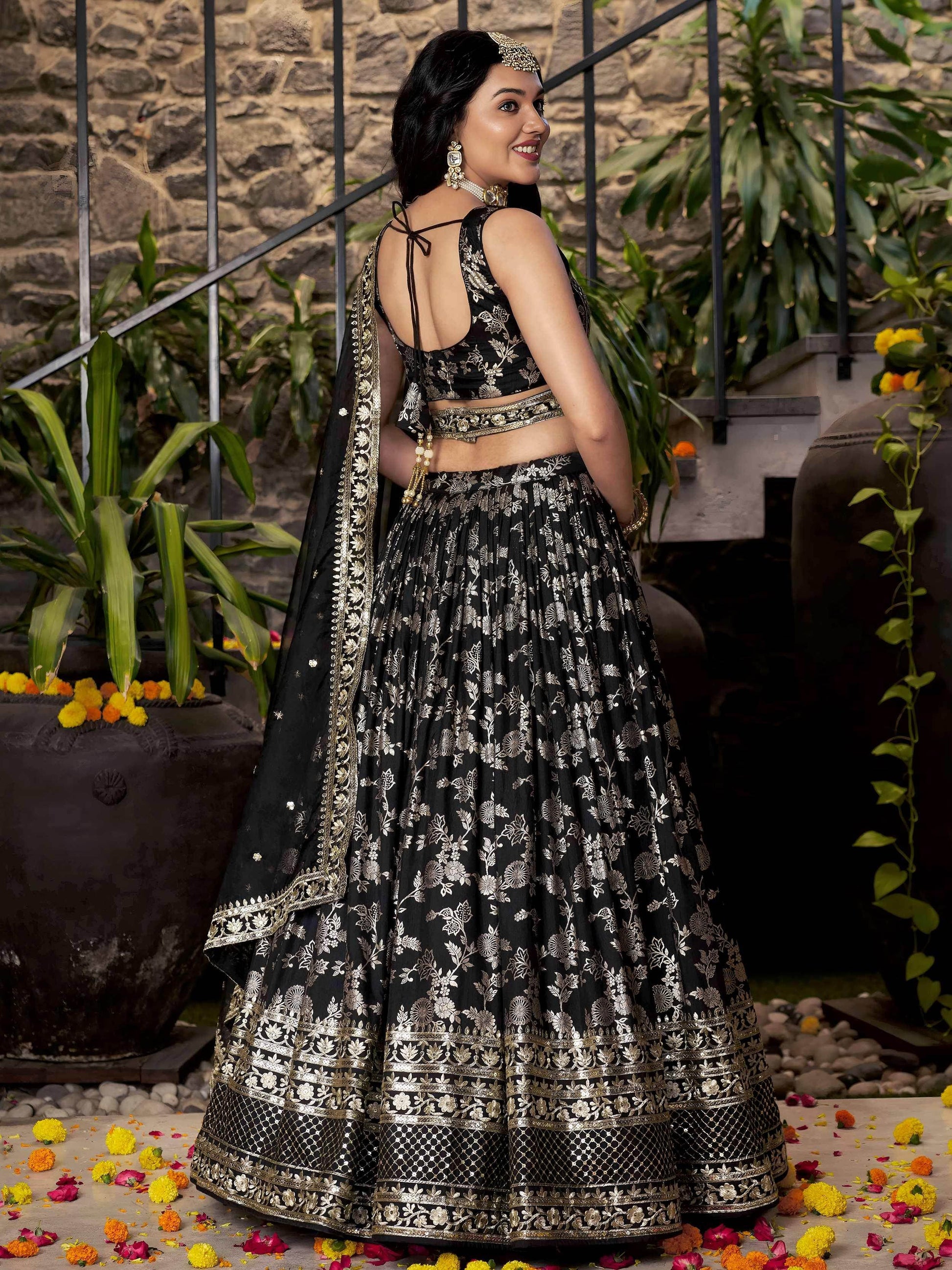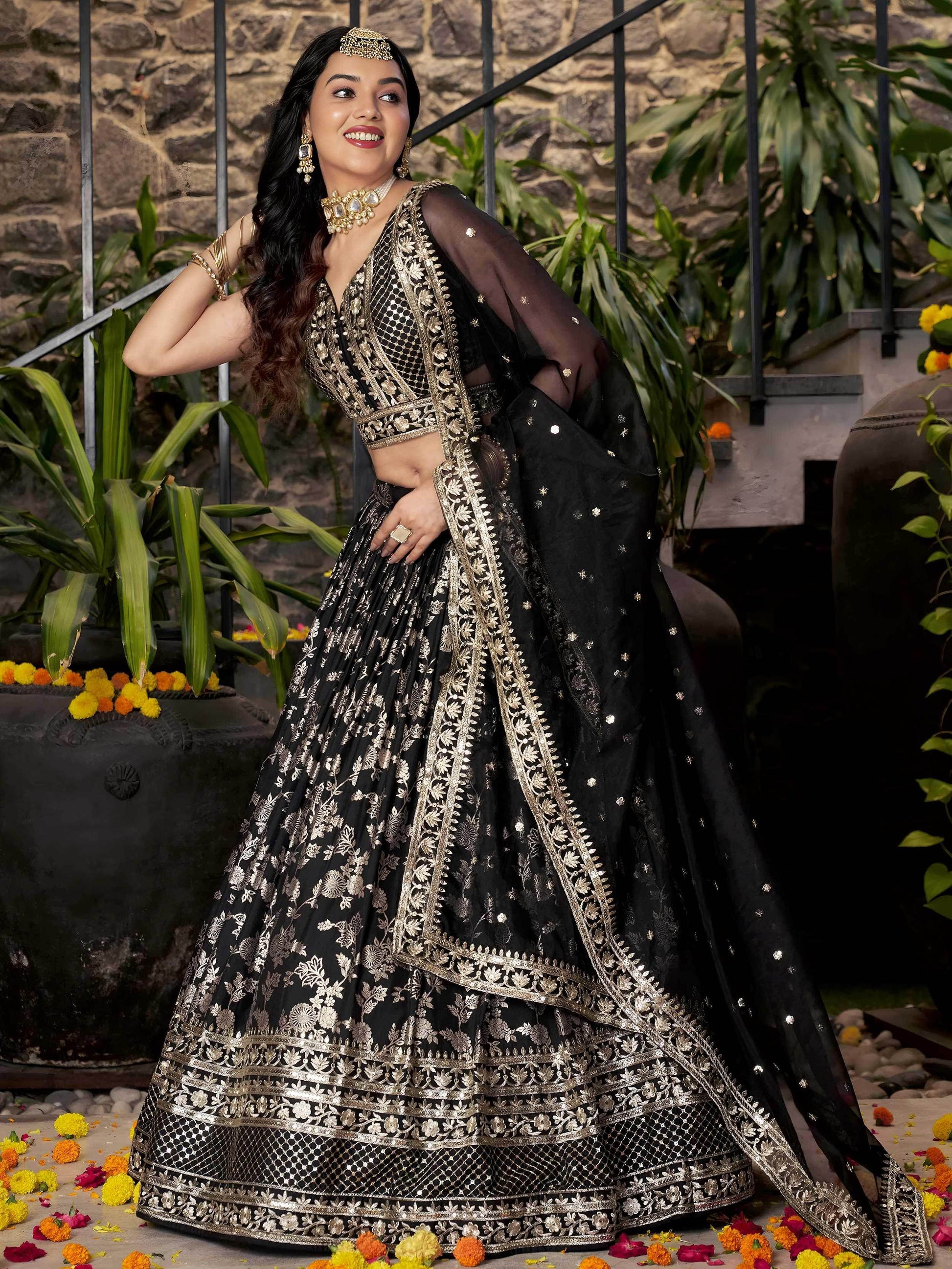 - This elegant black lehenga choli is crafted in premium Dola silk jacquard fabric for a regal finish. The skirt features intricate zari, dori, sequins, and multi-thread embroidery that adds rich festive charm.