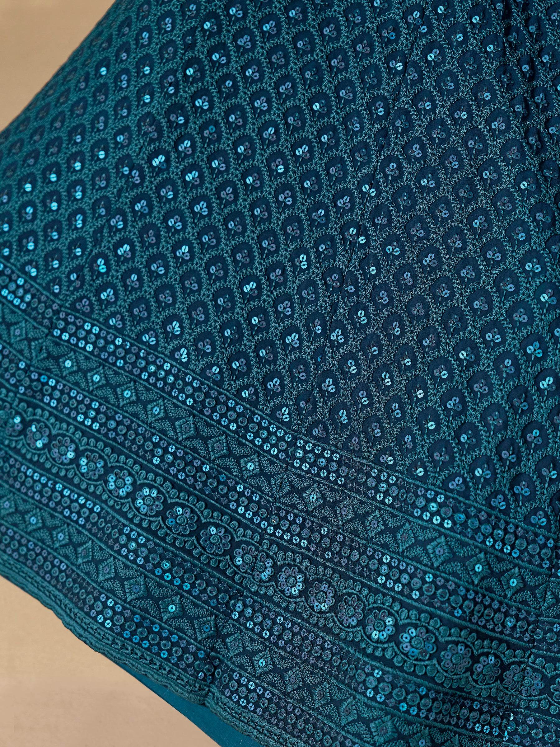 - This mesmerizing teal blue georgette lehenga, exquisitely crafted with sequins and thread embroidered work that adds a graceful shimmer to its rich tone.