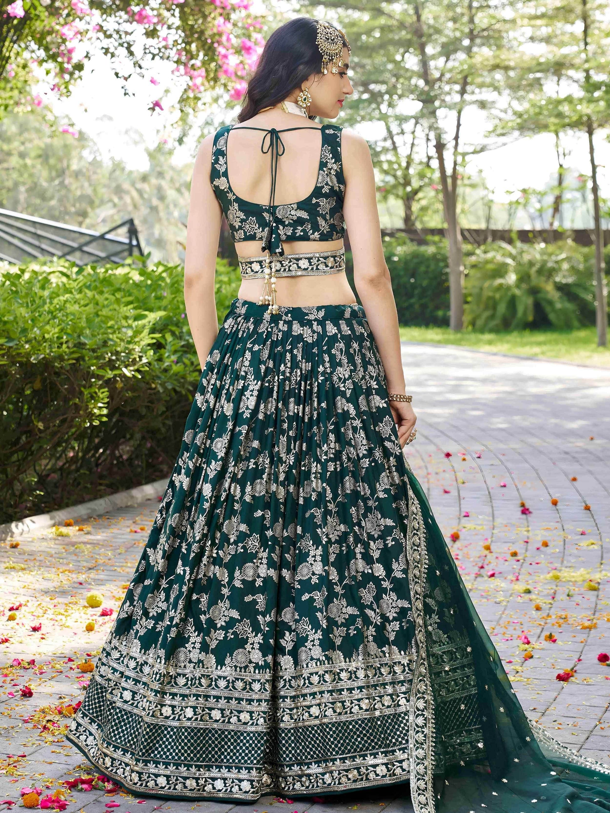 - Make a grand statement with this green Dola silk jacquard lehenga choli, designed to dazzle with traditional finesse. The skirt showcases all-over floral zari and sequins embroidery with detailed jacquard border work.