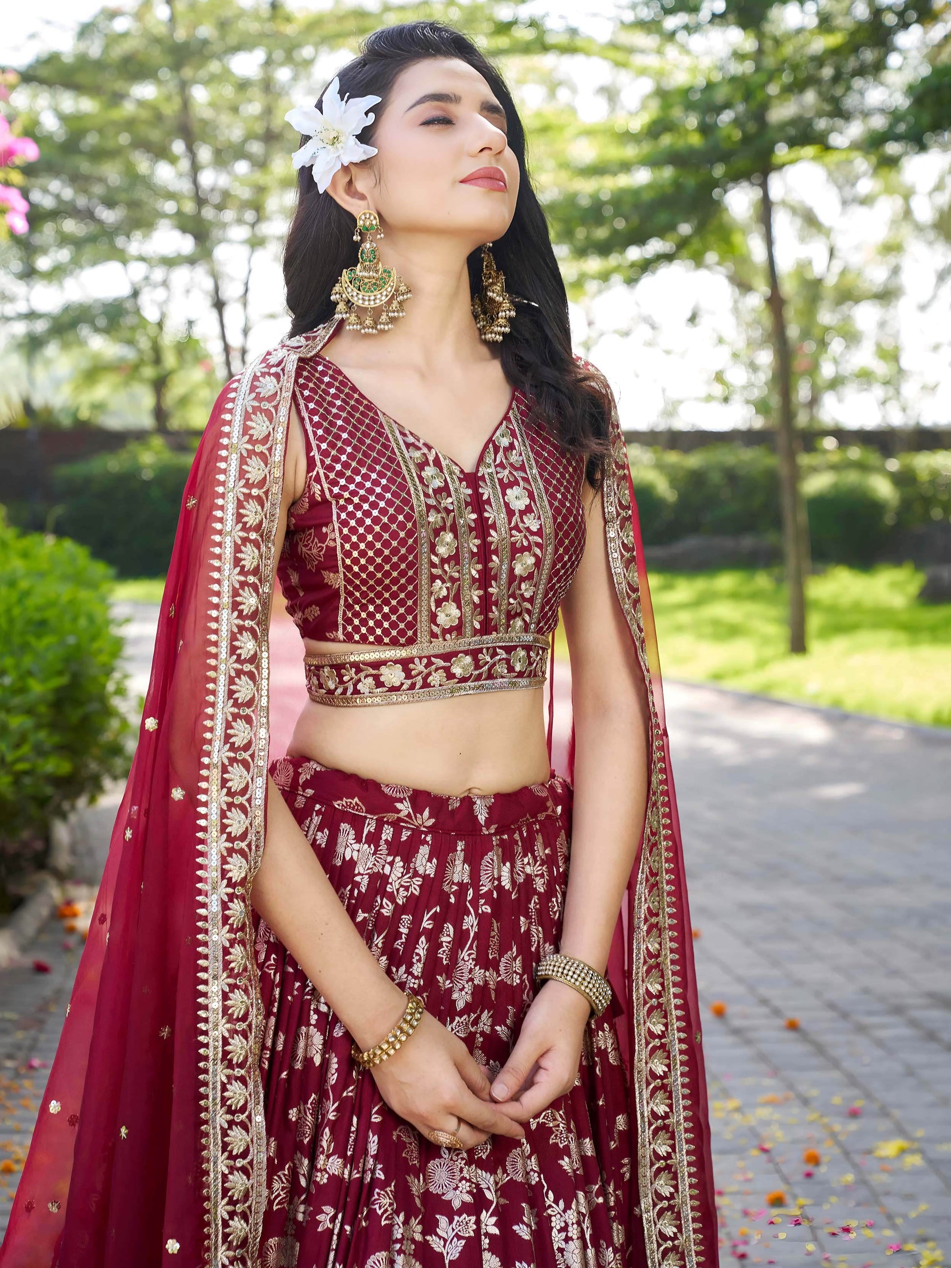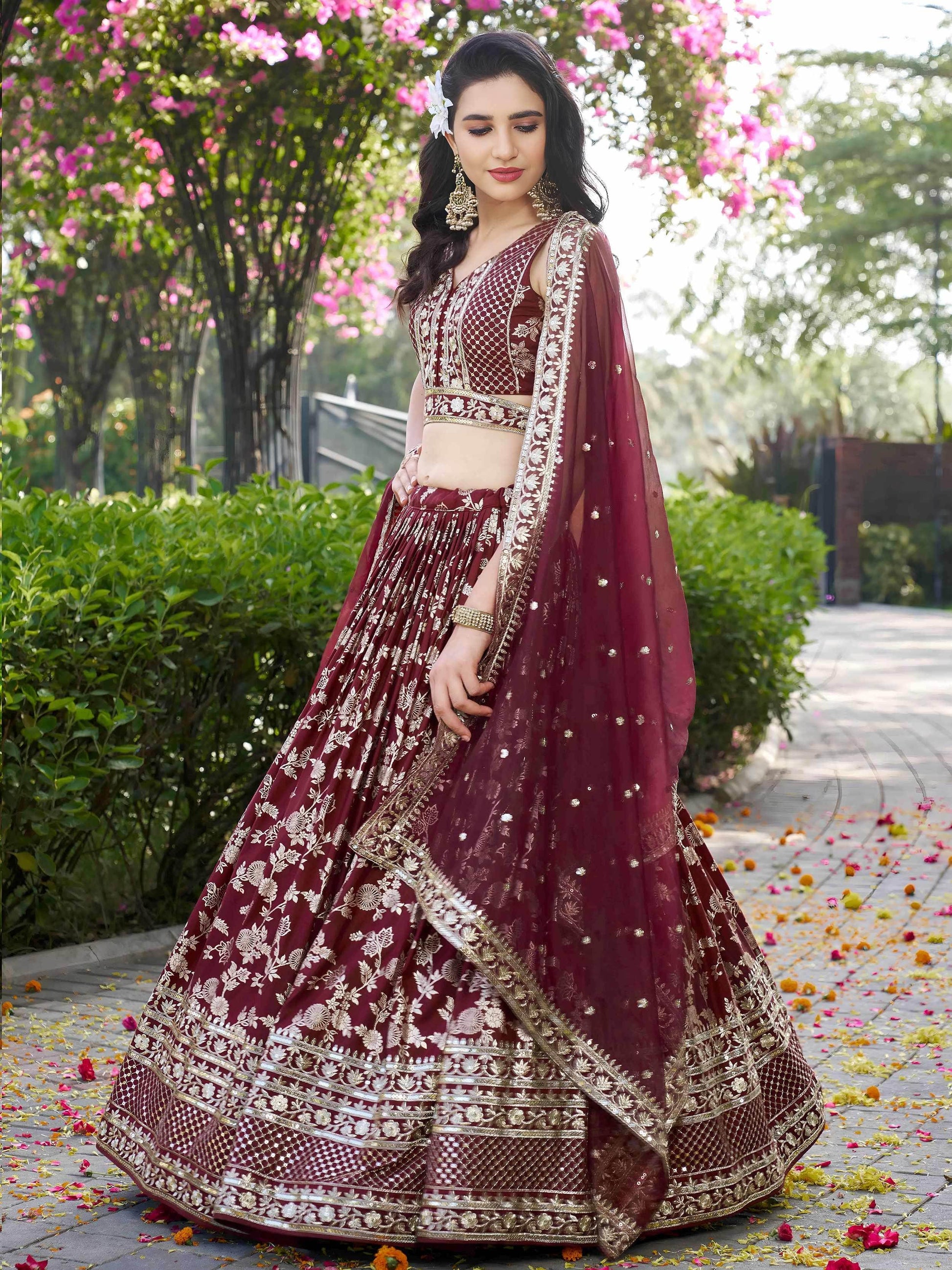 - The flared lehenga skirt is beautifully adorned with metallic floral motifs and heavy embroidery at the hem, offering volume and movement. It's crafted to elevate your presence at any celebration or ceremony.
