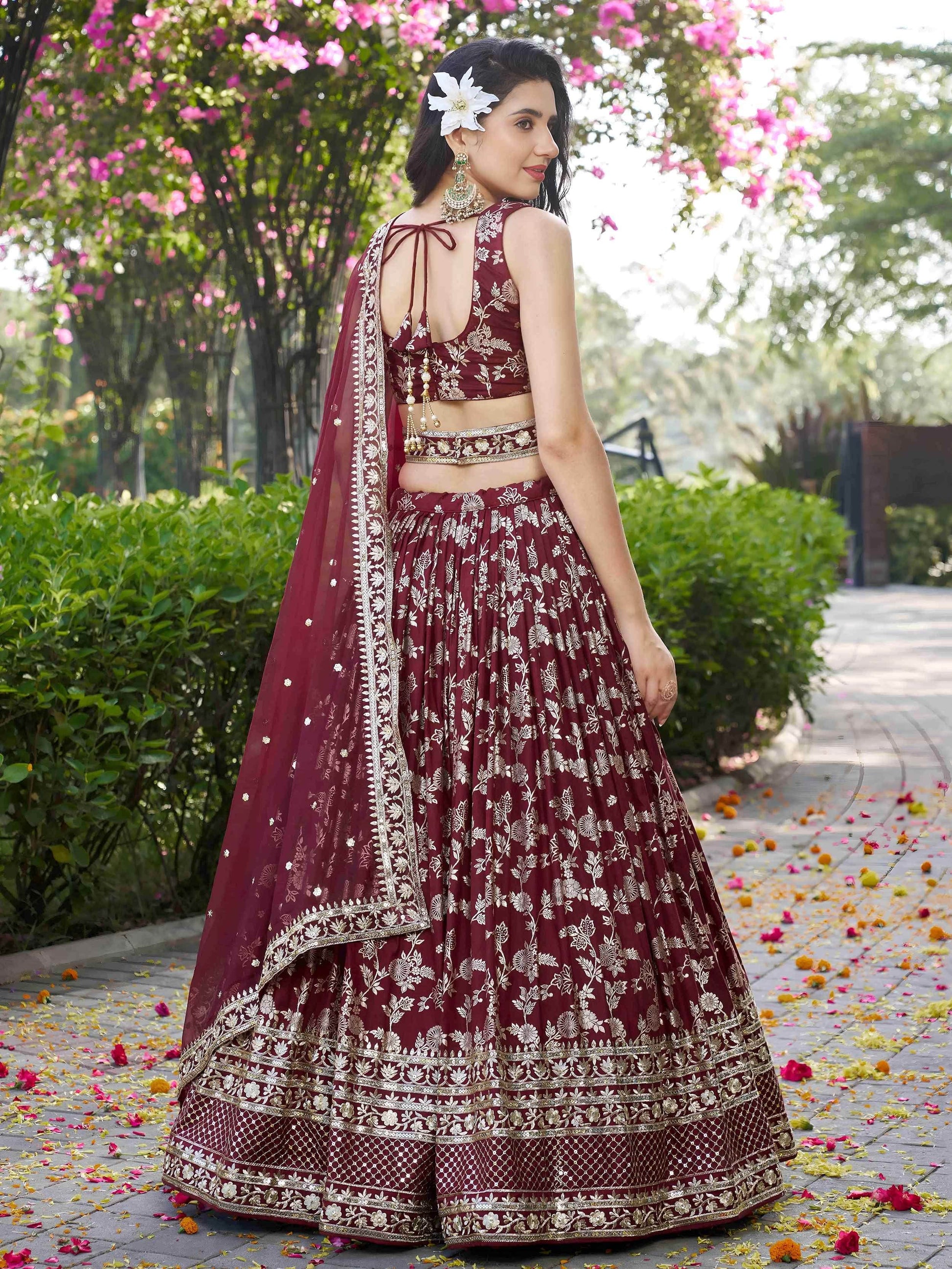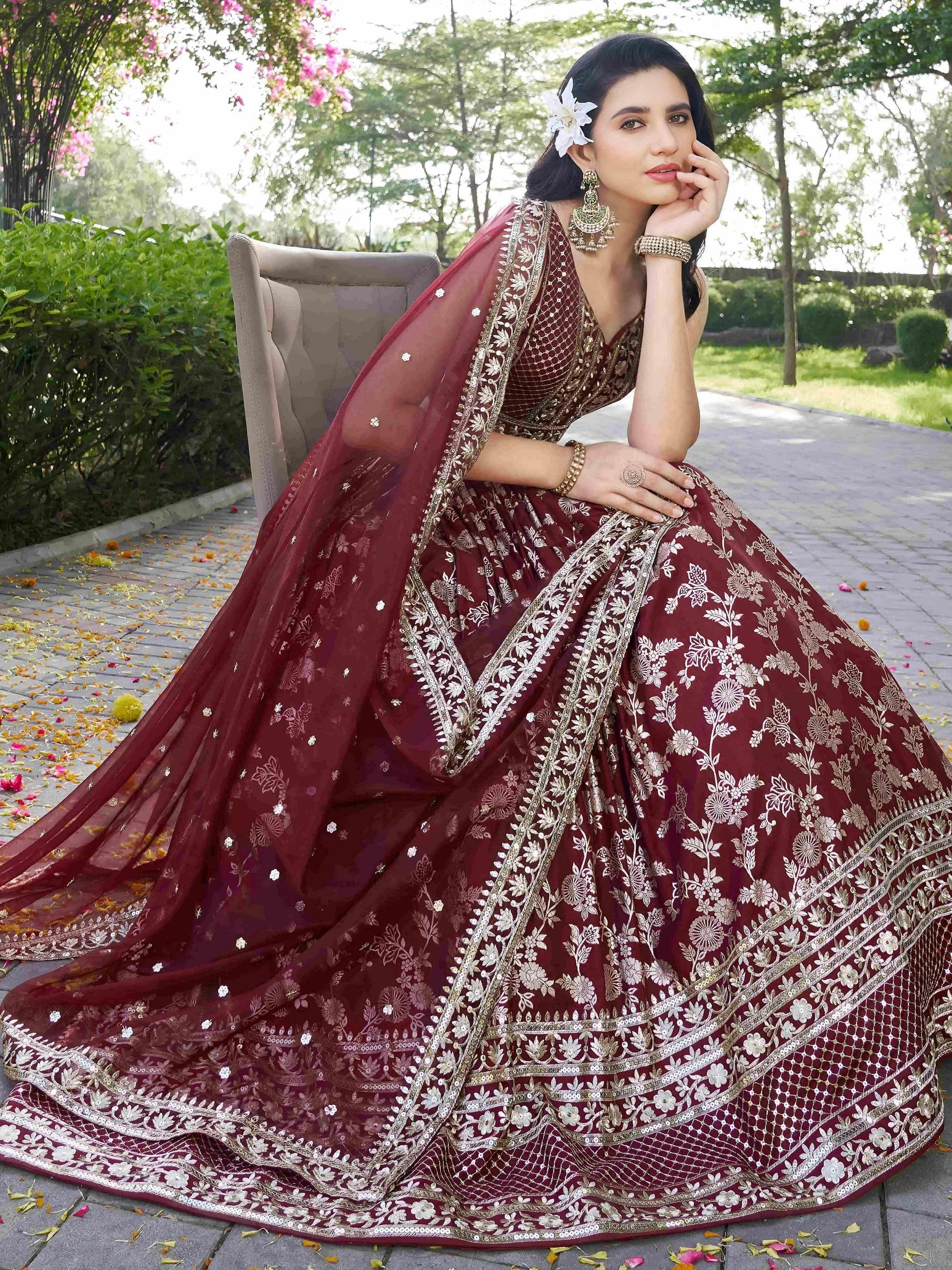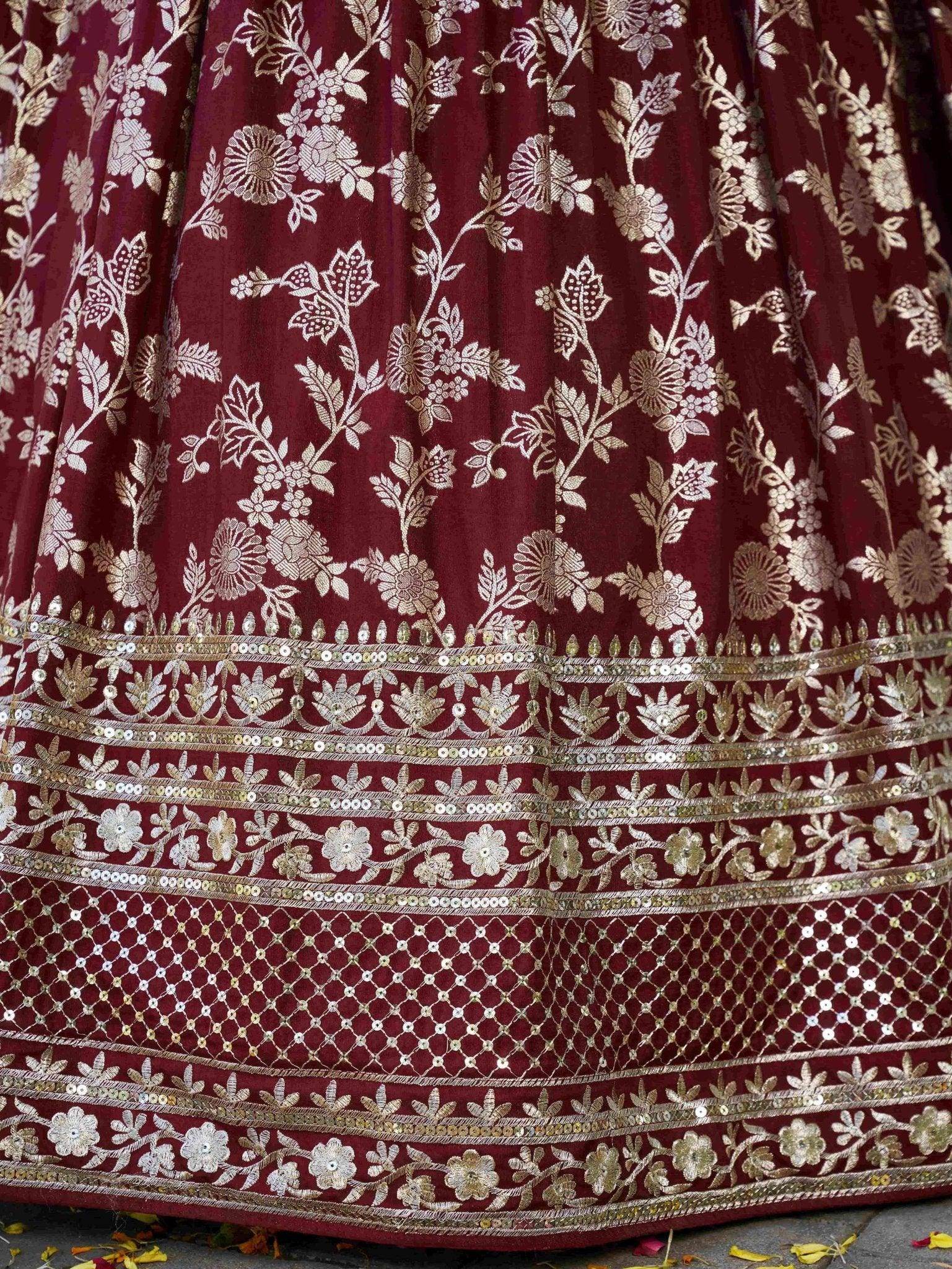 - Make a grand entrance in this rich maroon Dola Silk Jacquard lehenga, exuding regal elegance. Adorned with exquisite Zari, Dori, sequins, and multicolor thread embroidery, it's a perfect fusion of tradition and glam.