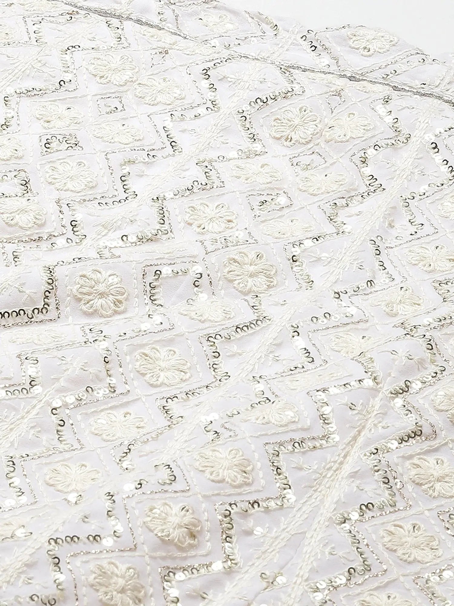 - The intricate thread embroidery is paired with scattered sequins, forming floral and diamond motifs across the blouse and lehenga. Each design glistens with subtle shimmer, perfect for festive and wedding occasions.
