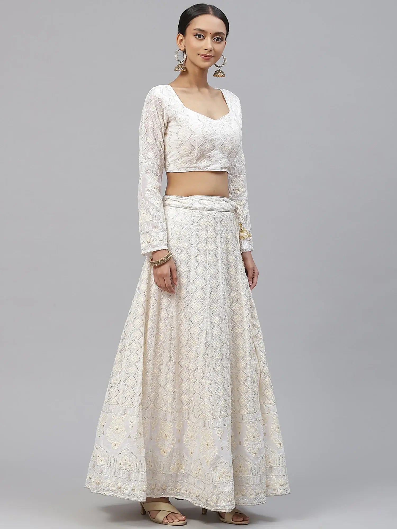 - Drape yourself in elegance with this white georgette lehenga choli that embodies traditional charm with modern grace. The full-sleeved blouse features tie-up back detailing and a sweetheart neckline, bringing out a refined silhouette.