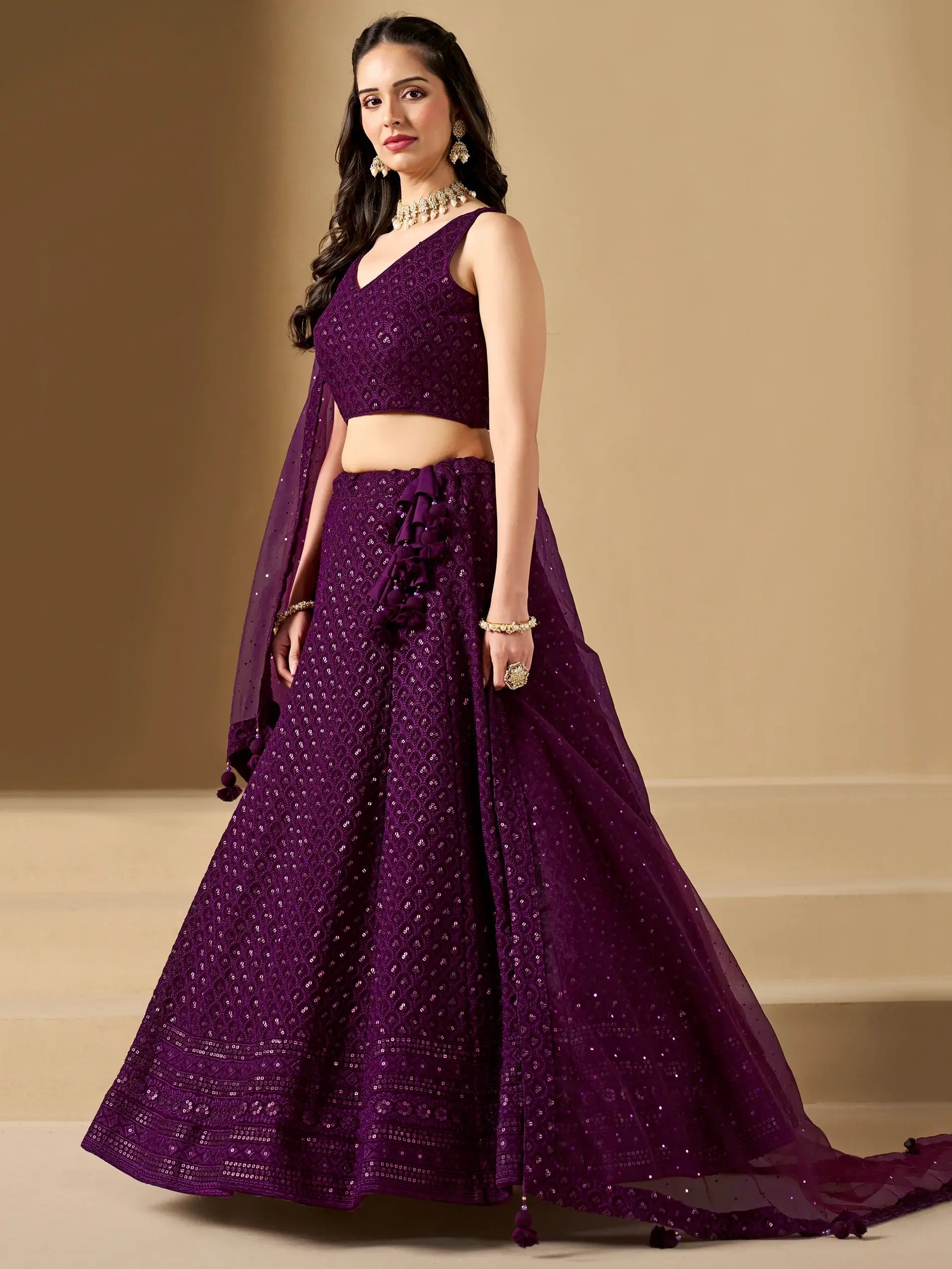 - Turn heads at your next celebration with this stunning wine color georgette lehenga, intricately adorned with sequins and thread-embroidered work that exudes regal elegance.