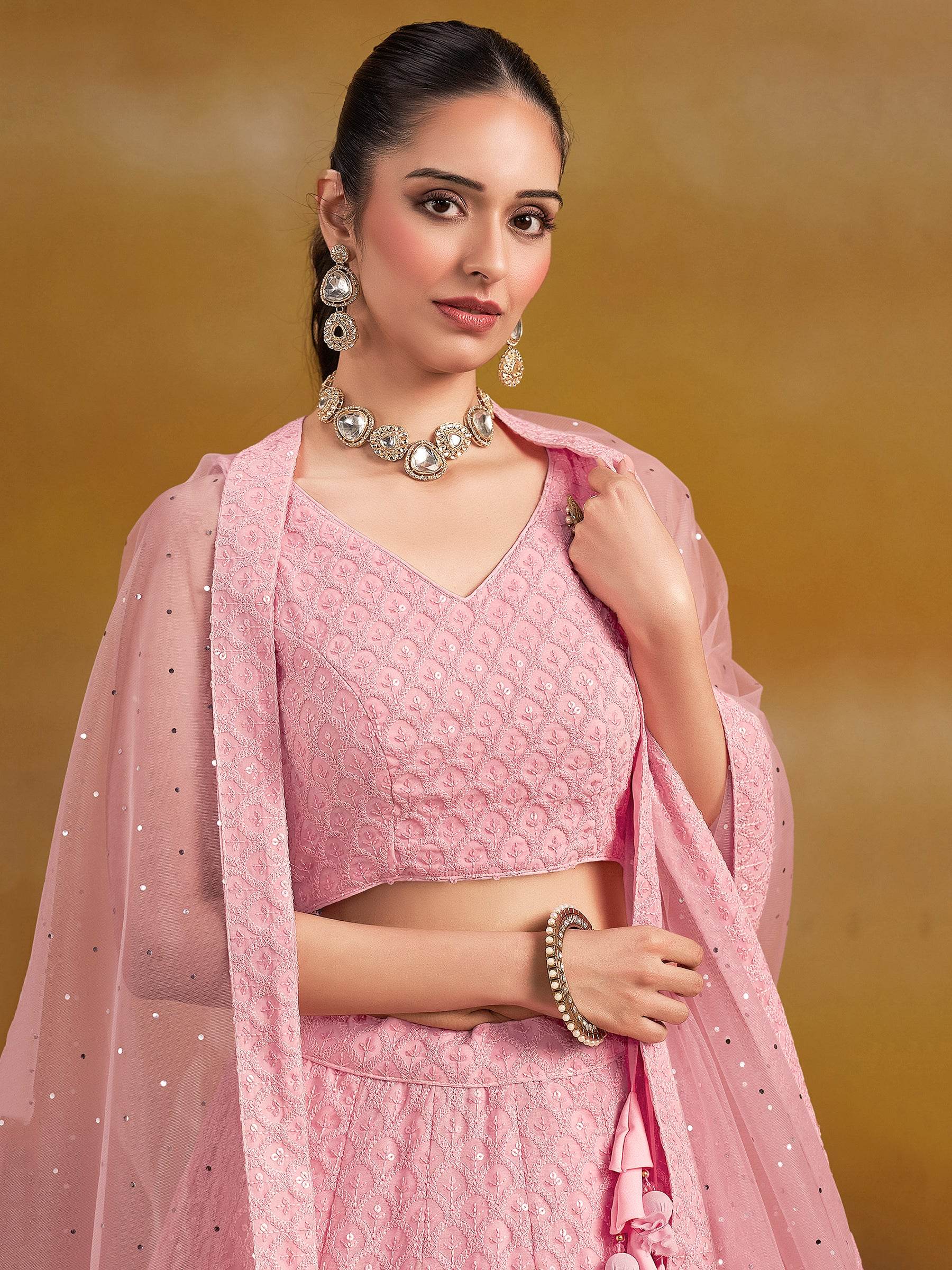 - This precious pink georgette lehenga is gracefully adorned with shimmering sequins and delicate thread embroidery work.