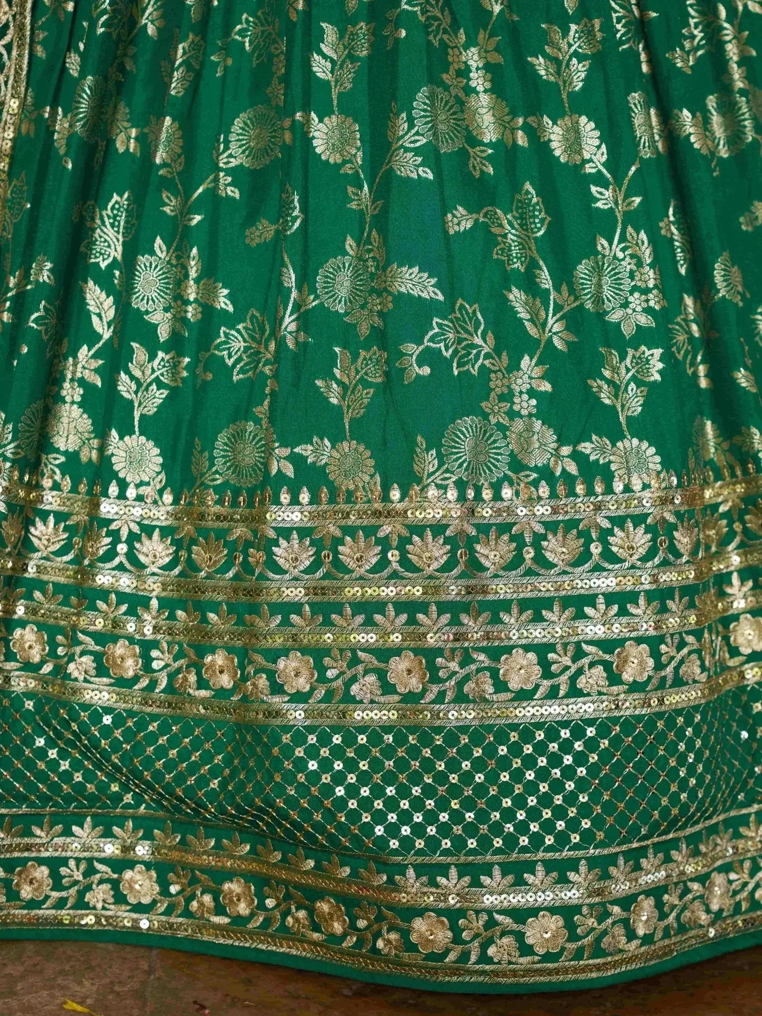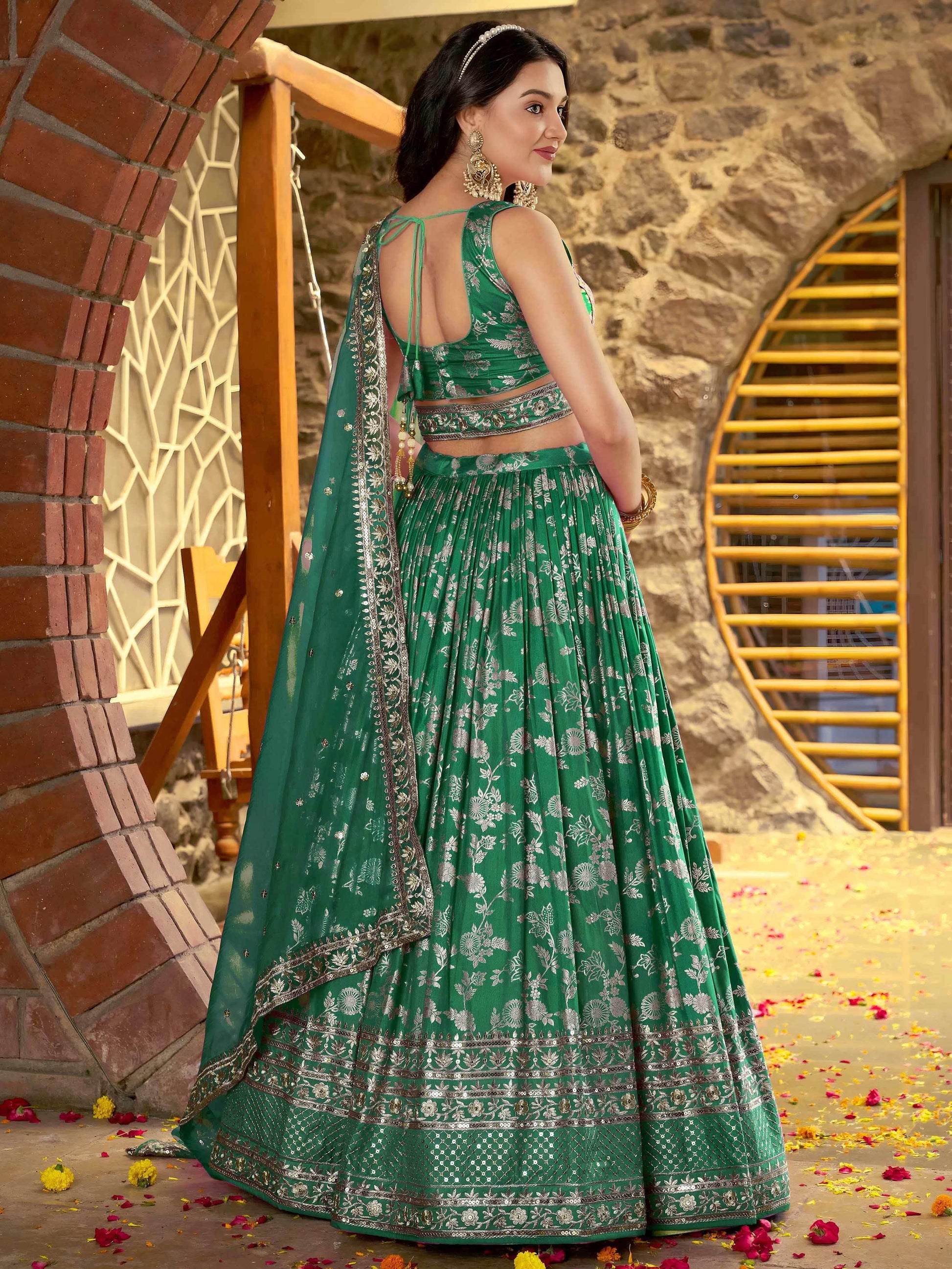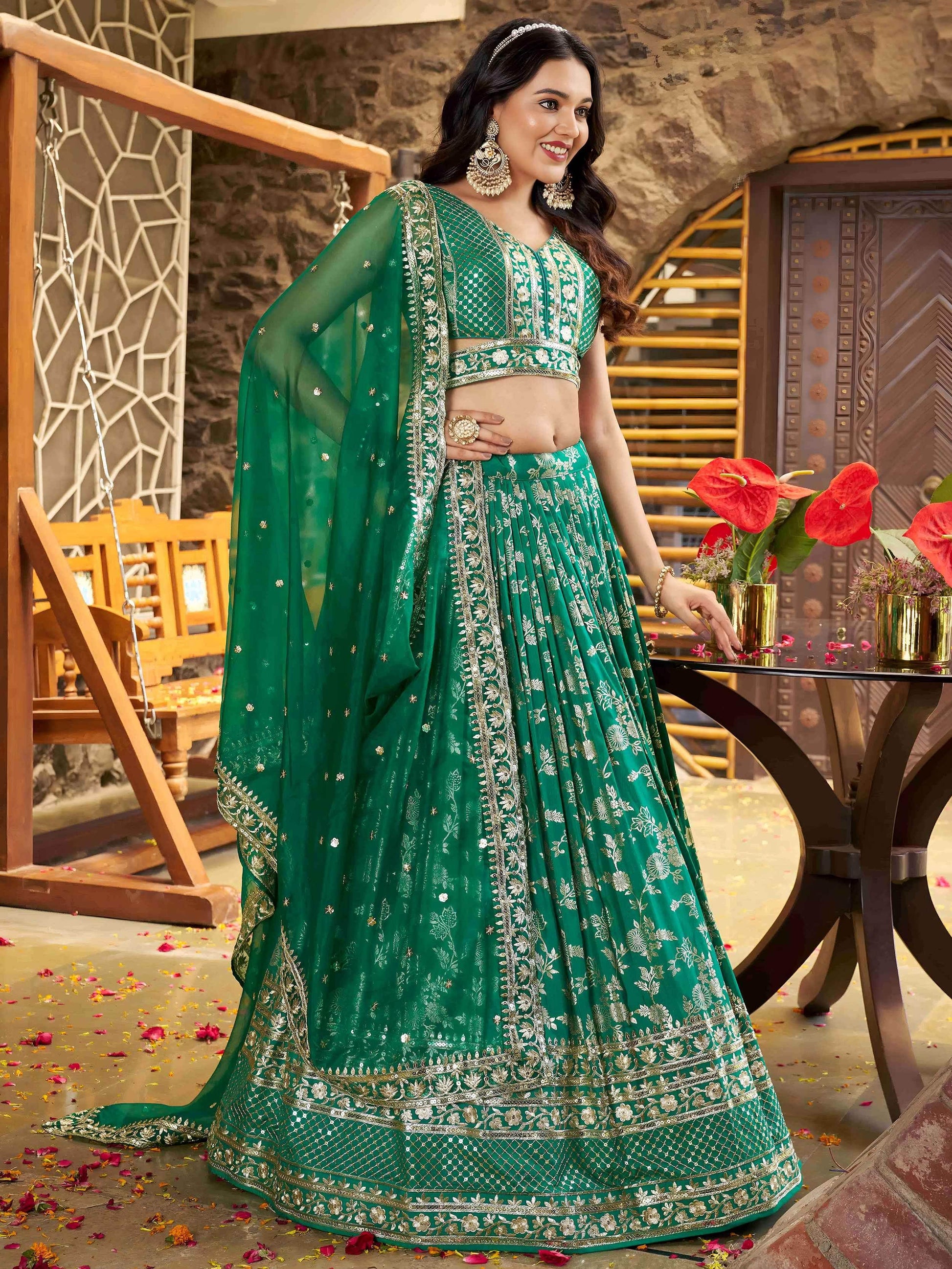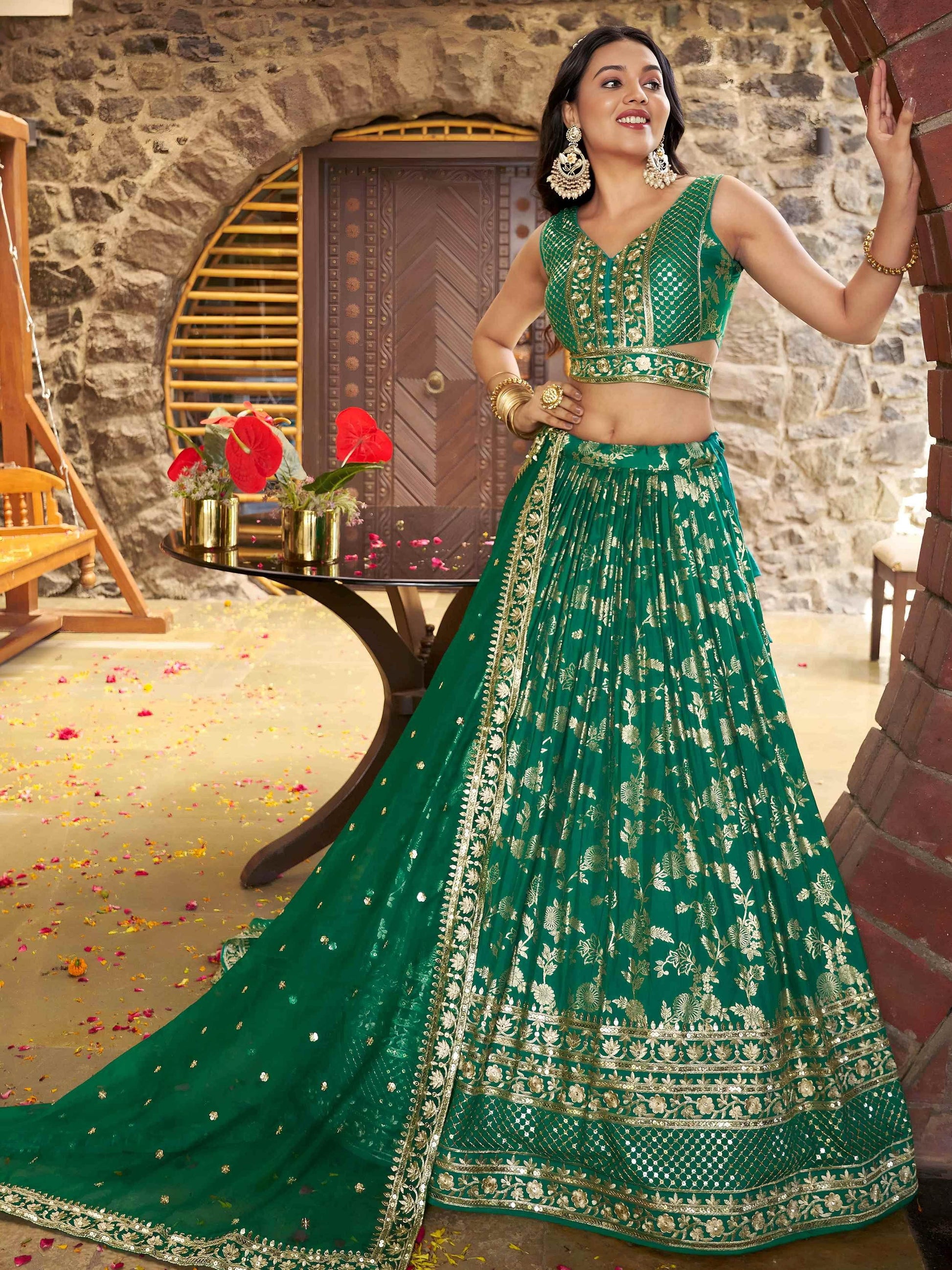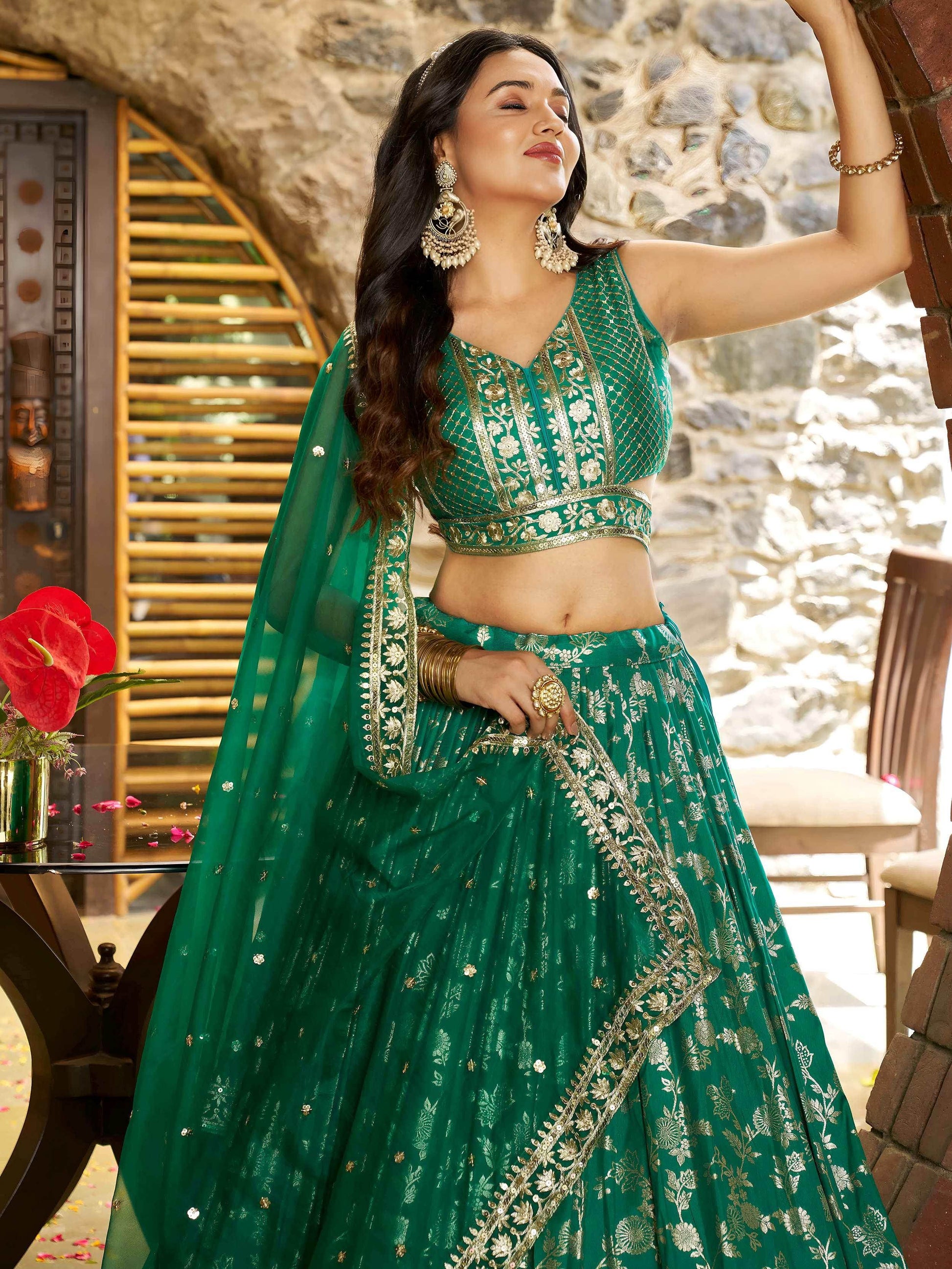 - Elevate your festive charm with this Rama green dola silk jacquard lehenga, adorned with intricate multi-color thread, sequins, zari, and dori embroidery. The beautifully pleated flare creates a royal silhouette that’s perfect for grand occasions.