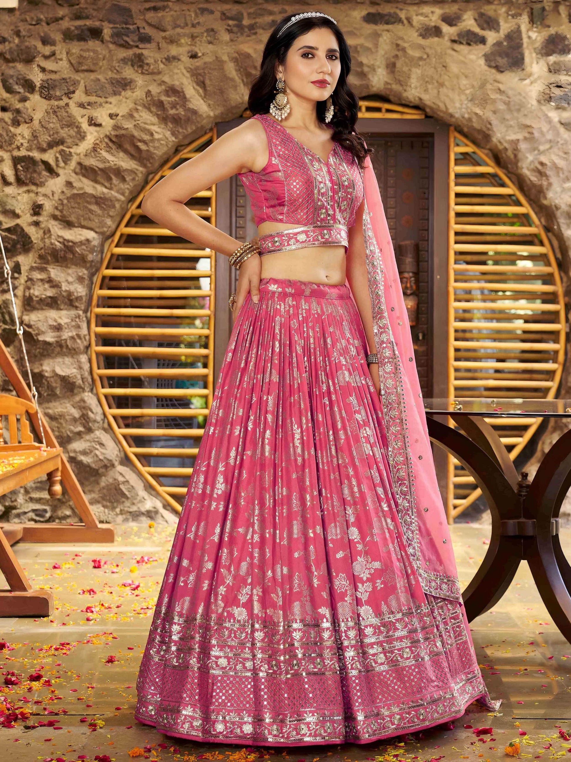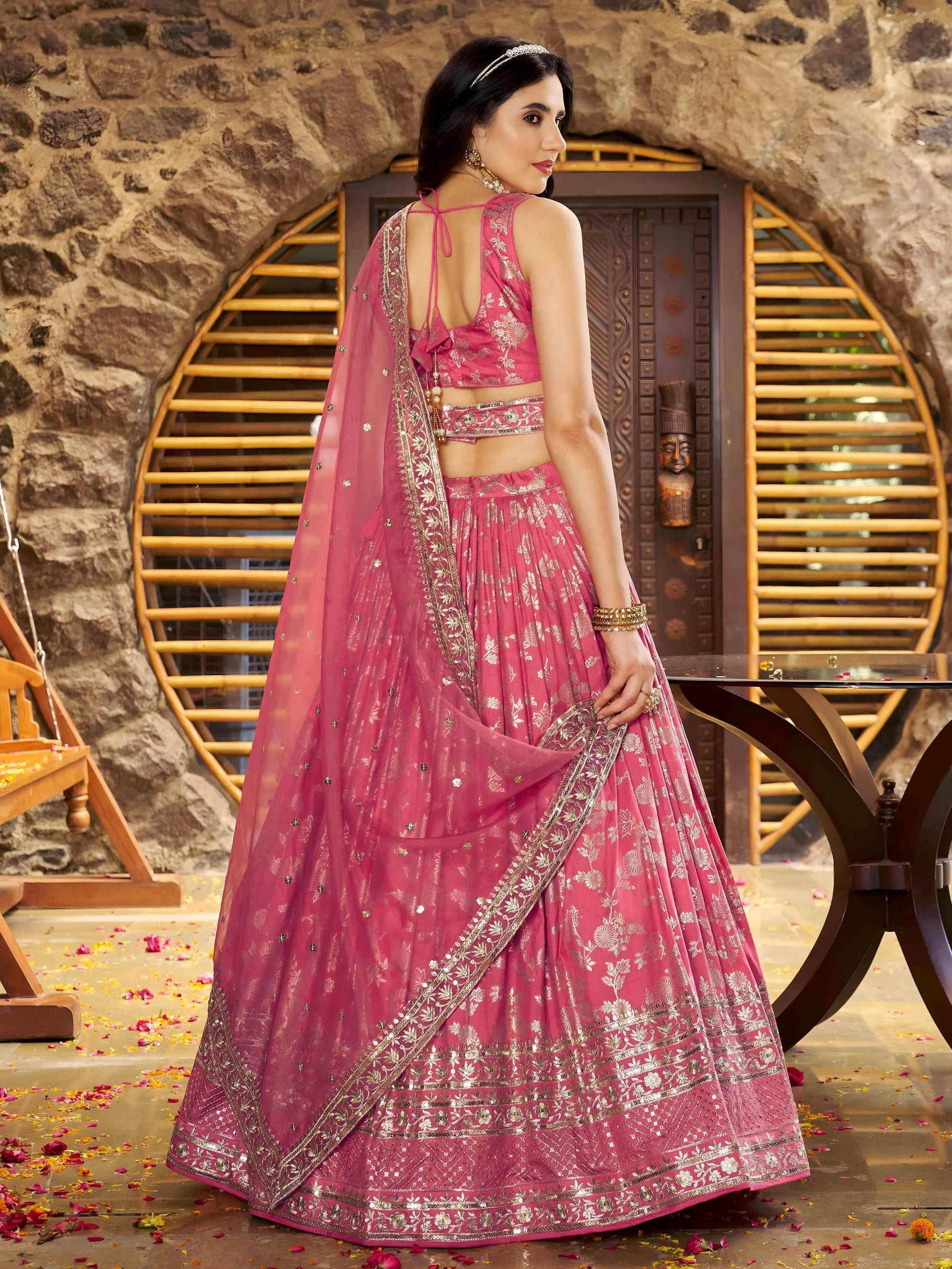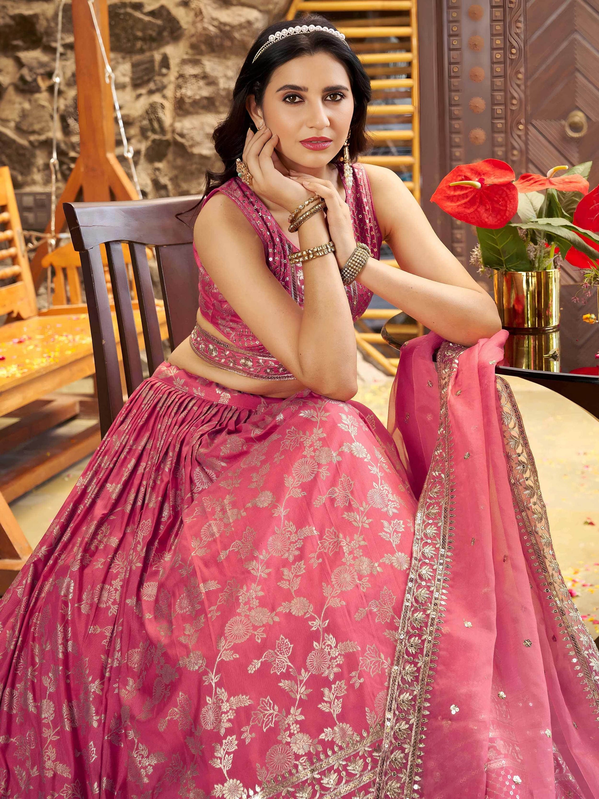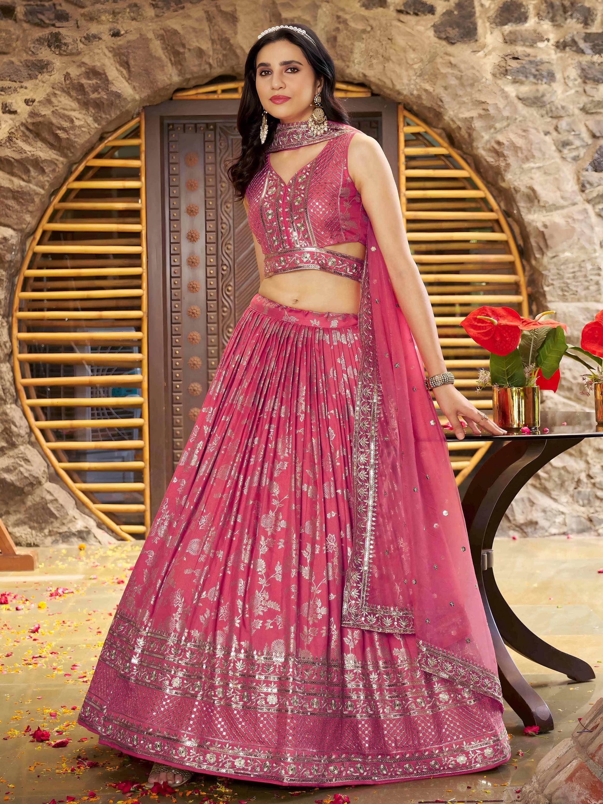 - This peach-colored lehenga choli set is crafted from luxurious dola silk jacquard fabric, radiating regal charm. The lehenga showcases intricate zari, sequins, and thread embroidery work throughout.