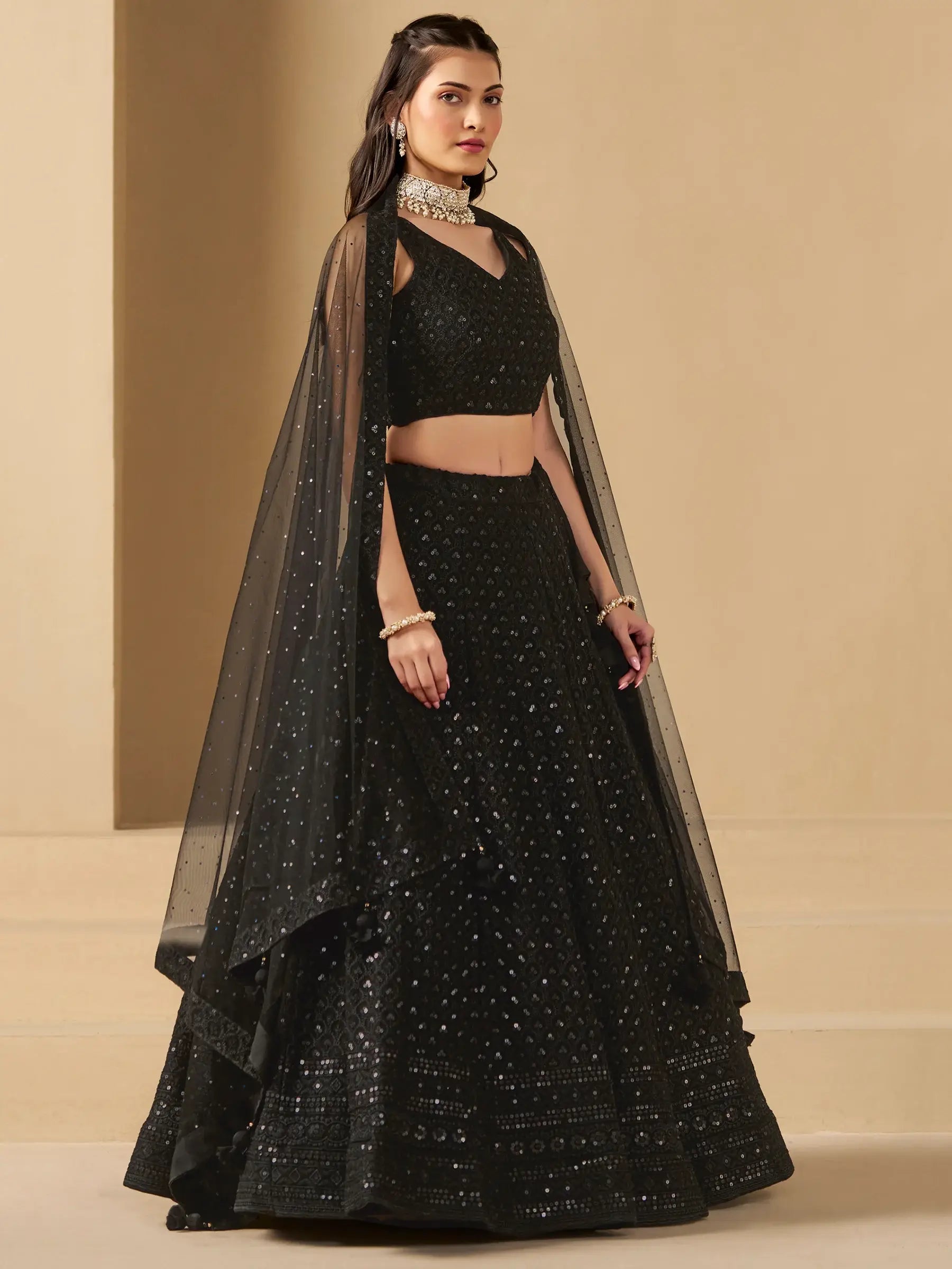 - This stunning black color georgette lehenga, elegantly adorned with intricate sequins and thread embroidered work that adds a touch of sparkle and sophistication.